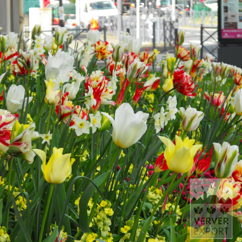 Alle guten Dinge sind… spät. Eine Mischung, die gegen Ende des Frühlings ein zauberhaftes Schauspiel bietet. Papageien- und Viridflora-Tulpen entfalten zahlreiche geflammte Blüten. Ein imposanter Anblick!
