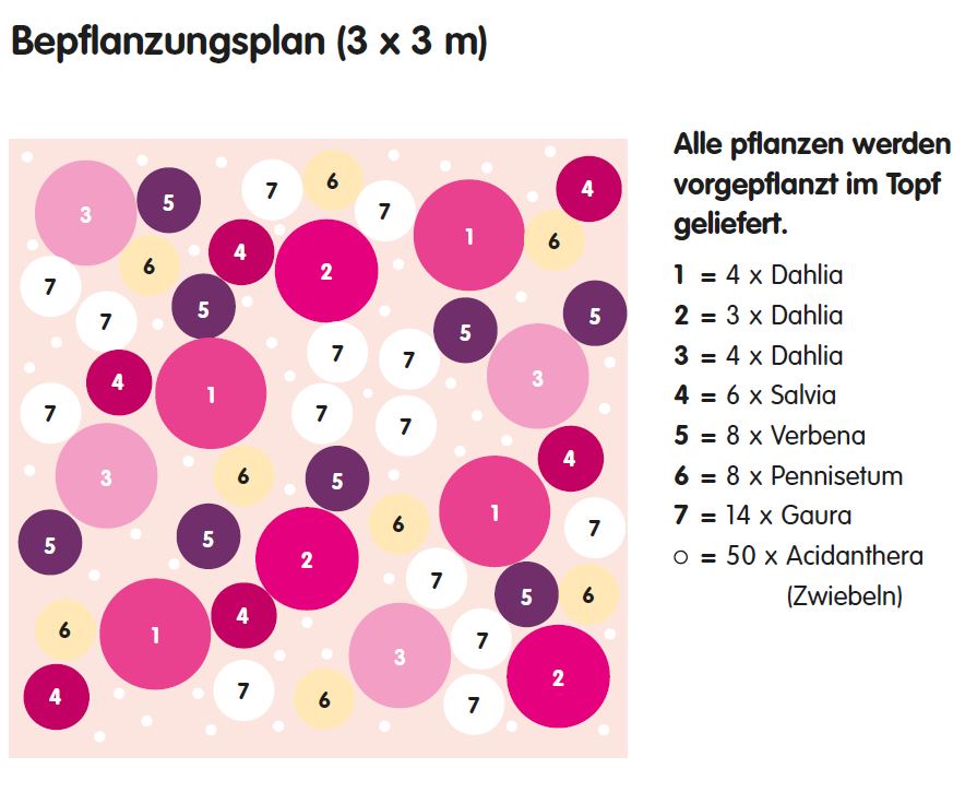 Ein Pflanzplan ist bei diesen Konzepten im Lieferumfang enthalten. Wenn Sie der glückliche Gewinner sind, können Sie die Stadt bei der Bepflanzung und Pflege dieses blühenden Sommerbeets unterstützen. In den ersten Wochen müssen Sie bei trockenem Wetter gießen und etwas Unkraut entfernen. Nach 4 bis 6 Wochen sind die Pflanzen vollständig entwickelt und das Unkraut hat keine Chance mehr.