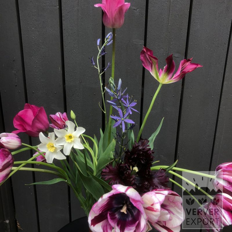 The mixture continues to flower for a long time. It is combined with late flowering narcissi and a Camassia.