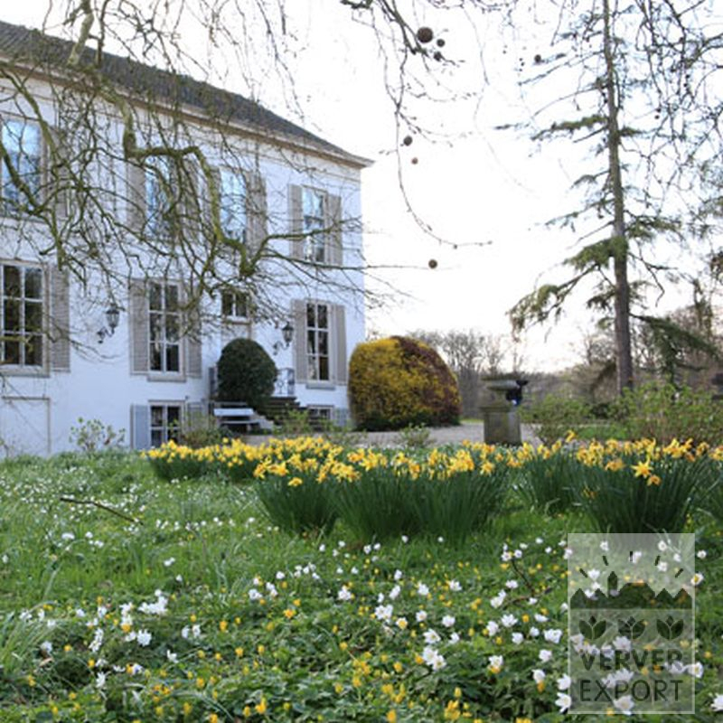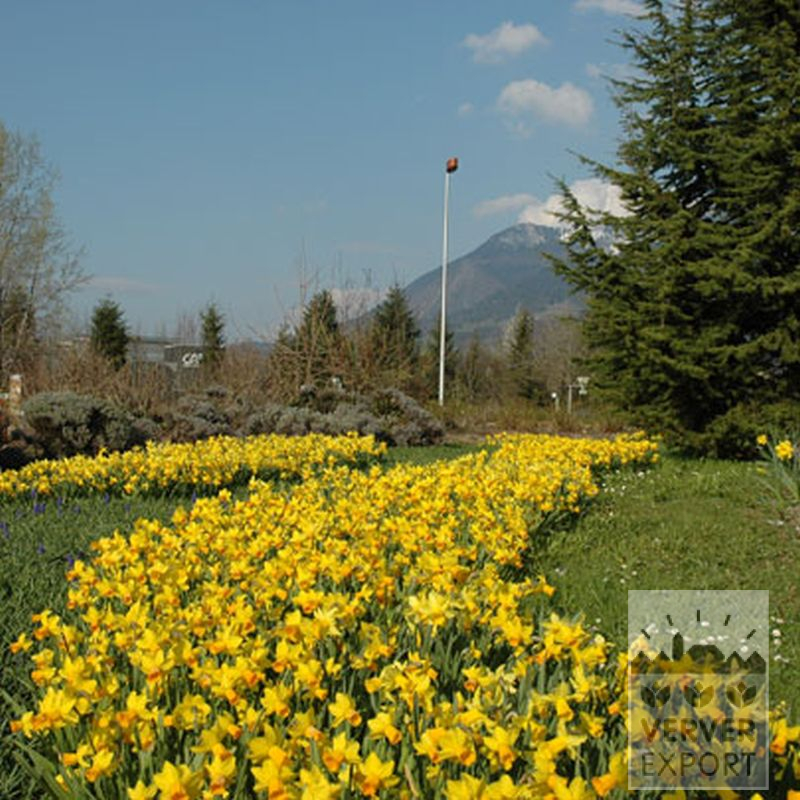 Create beds next to one another: Narcissus ‘Fortissimo’ (yellow with an orange cup) and Tulipa fosteriana ‘Orange Emperor’. You could even mix them.