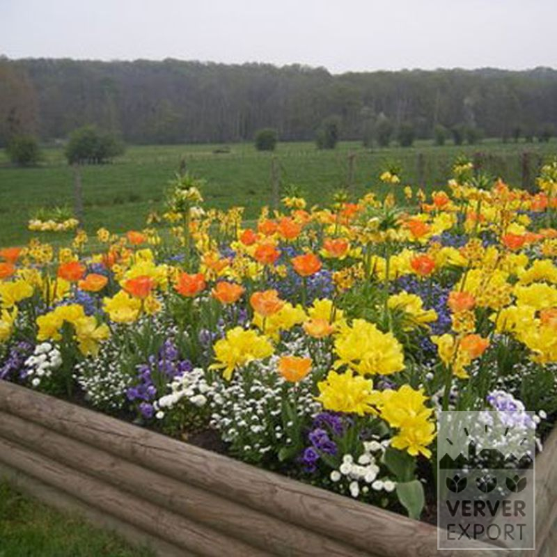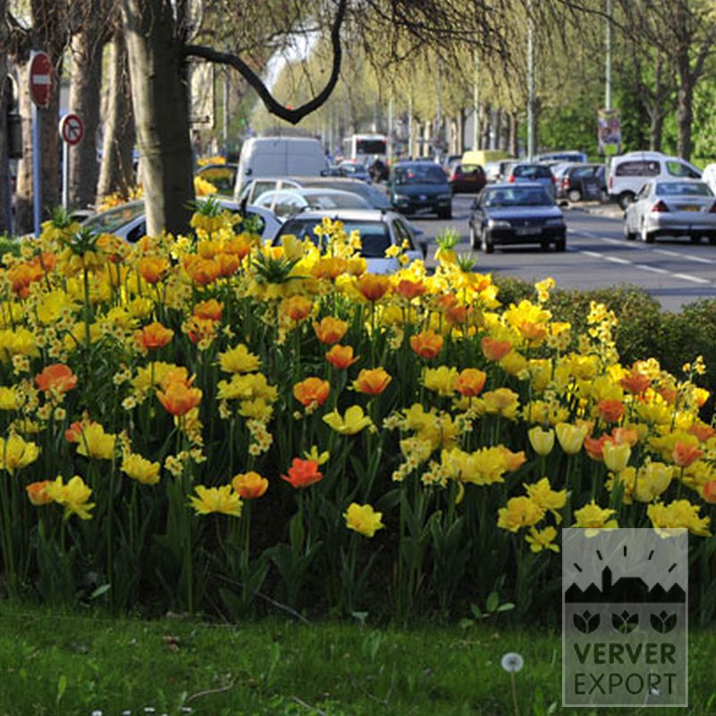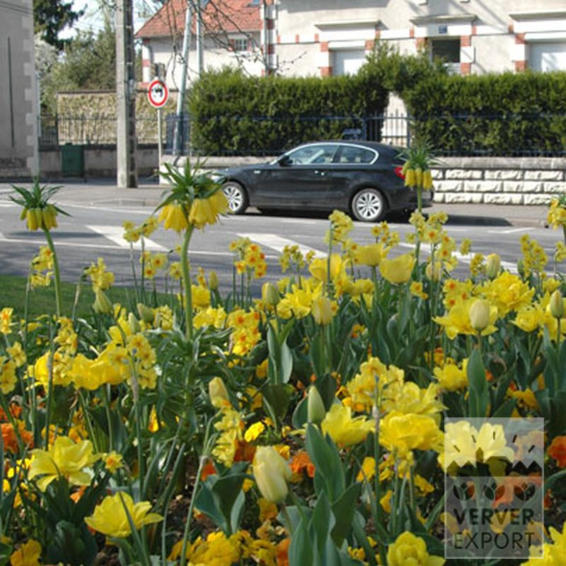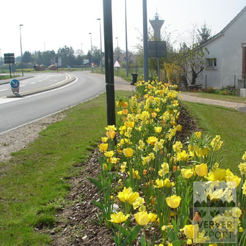 Un mélange puissant avec de nombreux coloris jaunes très gais accentués d’orange. Grand impact grâce à la composition des couleurs et à la structure : édifiée en étages avec des tulipes naines et hautes, des narcisses petits et grands et la fritillaire couronne impériale très imposante.