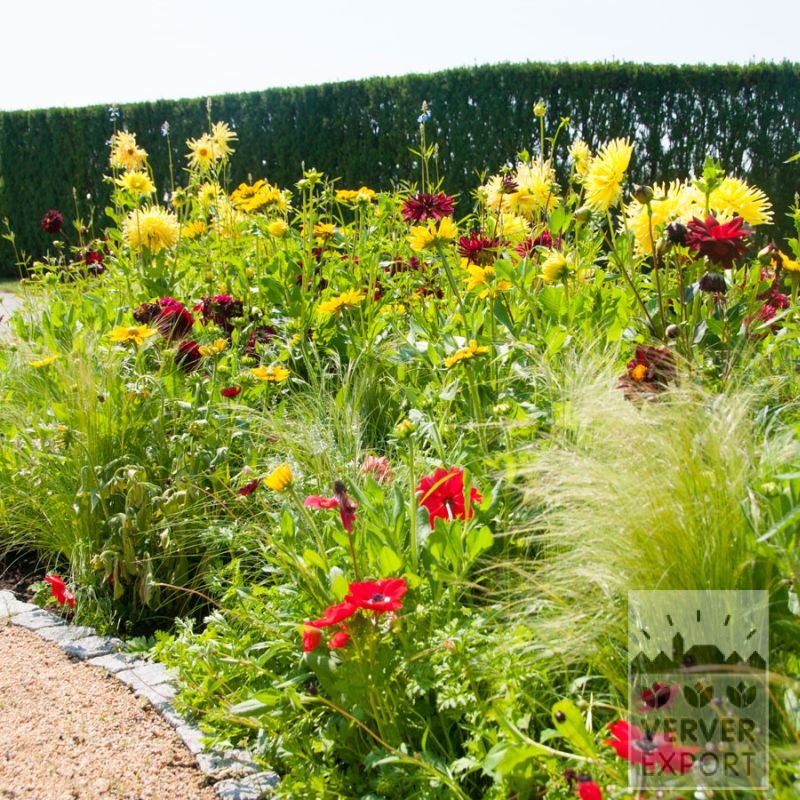 Couleurs primaires qui forment ensemble une agréable atmosphère estivale ! Des Dahlias robustes associés à des graminées ondulantes…