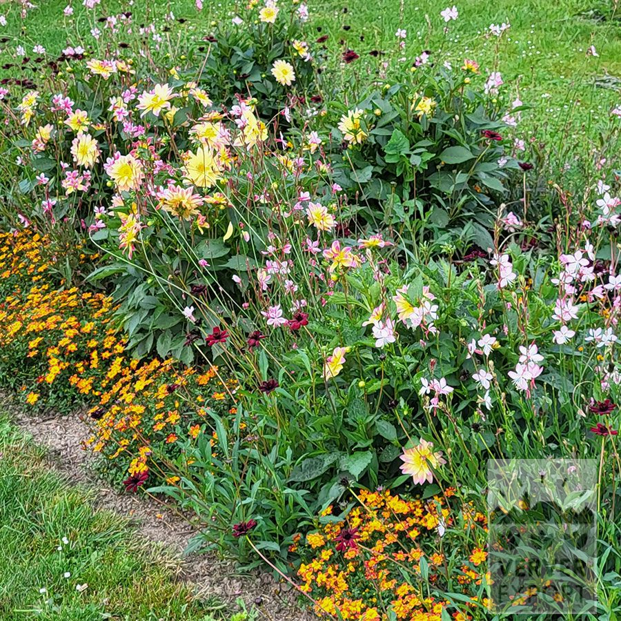 Plantation restant basse ! Dahlia florifère et compact associé à de joyeuses plantes annuelles, gracieuses ou couvrantes. Parfait pour les carrés de plantation qui ne doivent pas masquer la visibilité aux usagers de la route.