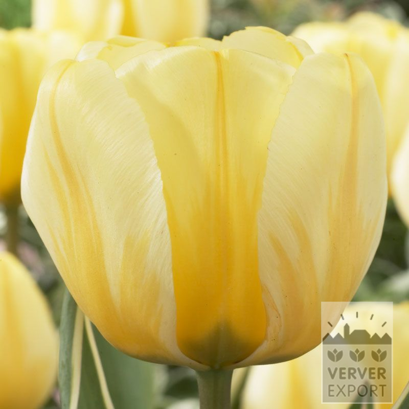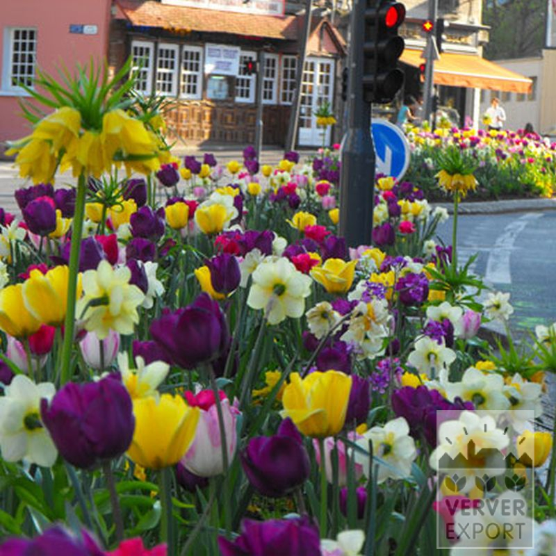 ‘Jaap Groot’ est appréciée pour sa belle fleur et son joli feuillage. La collection de tulipes à feuillage strié commence à être grande. Sur fond de cornutas violettes.