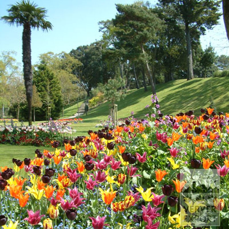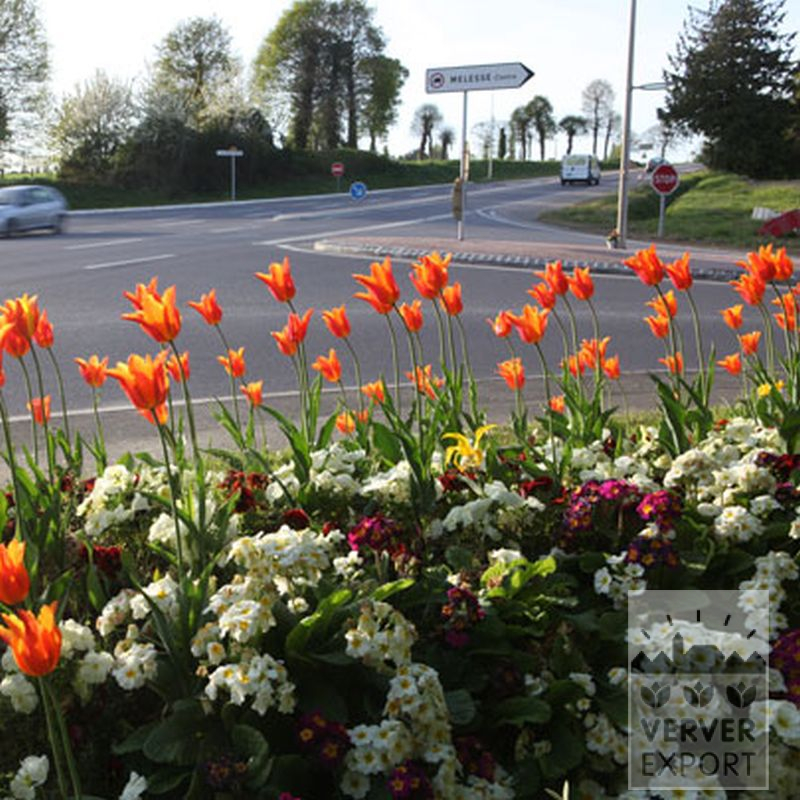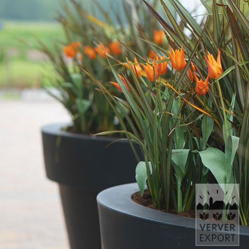 Plant een prachtige mix van de leliebloemige tulp ‘Ballerina’ (Oranje) en de enkele, laatbloeiende tulp ‘Queen of Night’ (Zwart) tegen een oranje ondergrond.