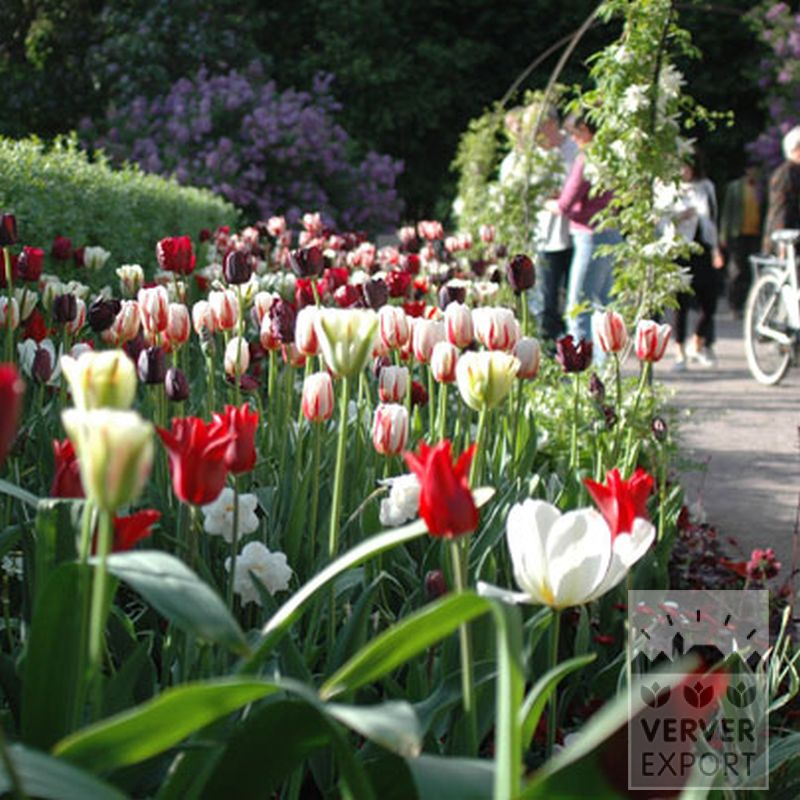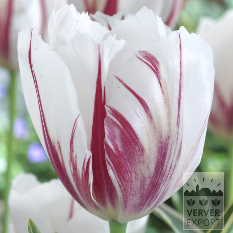 Een tulp die erg populair is bij ontwerpers die graag verschillende soorten tulpen mixen. Het unieke van deze witte tulp met rode vlammen wordt versterkt door de bonte bladeren.