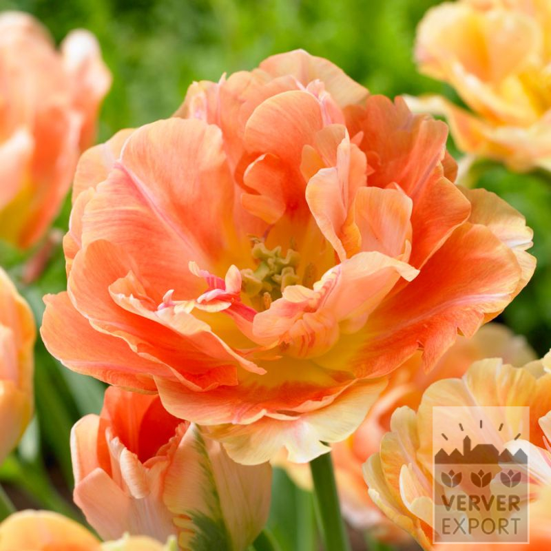 Oranje is de hoofdkleur, maar er zijn ook vleugjes abrikoos en roze. Grote bloemen op relatief sterke stengels.