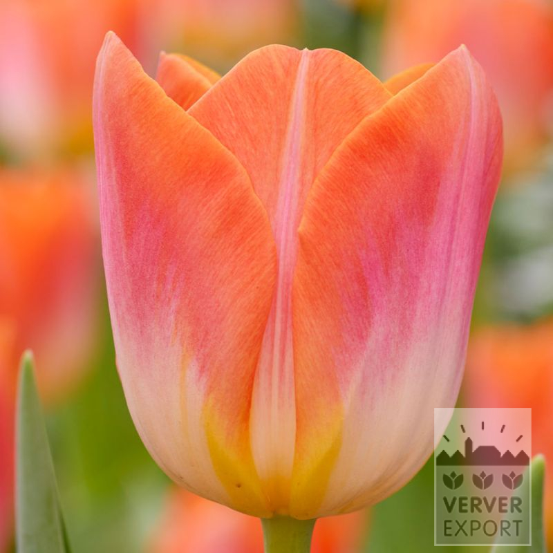 Deze tulp heeft net als ‘Salmon Dynasty’ een zachte gele voet, maar verder straalt de bloem een oranje-roze gloed uit.